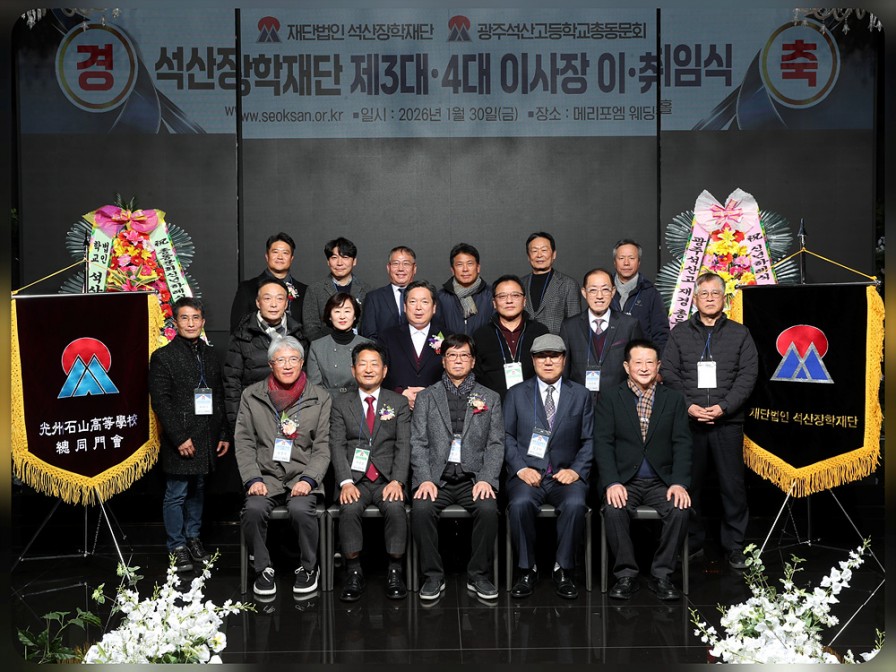 제3대.4대 이사장 이.취임식(2026.01.30) 페이지 정보 작성자관리자 댓글 0건 조회 58회 작성일 26-02-09 14:13 본문 ♣ 재단법인 석산장학재단 제3대.4대 이사장 이.취임식 ♣-일시: 2026년 1월 30일(금) 오후6시30분~-장소: 메리포엠웨딩홀-이임 이사장 박동호 3대 이사장(7회)-취임 이사장 손철용 4대 이사장(8회) 목록 다음글2026년 제1회 장학금수여식(2026.01.09) 26.02.05 댓글목록 댓글목록 등록된 댓글이 없습니다.